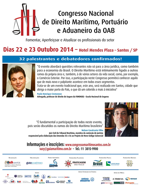 http://www.congressomaritimosantos.com.br/palestrantes.php "O evento abordará questões relevantes não só para a área jurídica, como também para a economia do Brasil. O Direito Marítimo está intimamente ligado a outros ramos da própria área e, também, à de vários setores da vida social, como, por exemplo, o Comércio Exterior. Por isso, a participação neste Congresso permitirá conhecer aquilo que de mais novo e palpitante acontece em todos esses segmentos. Trata-se de um evento tradicional que, este ano, será realizado em Santos, cidade que abriga o maior porto do País, o que dá um colorido a mais à iniciativa". Paulo Hernrique Cremoneze, advogado, professor de Direito do Seguro da FUNENSEG - Escola Nacional de Seguros******************* "É fundamental a participação de todos neste evento, pois serão discutidos os rumos do Direito Marítimo brasileiro" Informações e inscrições: www.congressomaritimosantos.com.br Fone: (11) 3815-9900 |